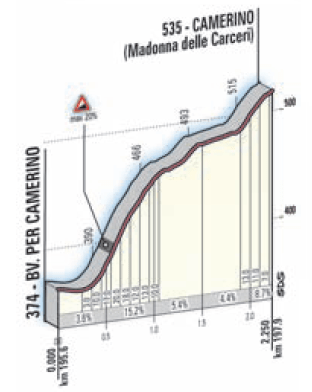 Una vez en la cima, irregular descenso hasta San Lorenzo al Lago (km 15,3 del perfil) donde empieza la doble ascensión de Fiastra + Cicconi (últimos 4,2 km). Superados estos repechos continua la bajada hacia Polverina, localidad que da paso a un pequeño tramo más o menos llano de 7 km, picando hacia arriba a partir de Sfercia. La siguiente subida es Camerino, aunque no se llegará hasta arriba, sino que se girará hacia la izquierda en la cota 540 m para después de un corto descenso llegar hasta la localidad por otra  variante: Madonna delle Carceri. Sus nº totales no parecen gran cosa, 2 km al 8,2 % … pero cuenta con un tramo de 600 m al 15% y rampas máximas del 20%. Una buena encerrona.