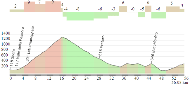 Y es que los 50 km finales del recorrido  ofrecen muy poco respiro, teniendo que afrontar continuas ascensiones … y ojo a los descensos, ya que algunos son muy revirados y con fuerte pendiente. De hecho el único tramo llano de cierta longitud está después del primero de los puertos, Casalincontrada,  pero a partir de ahí pero se encadenan Bucchianico, Villamagna, Ripa Teatina, Torrevechia Teatina y ya dentro de Chieti el duro repecho de la Via Salomone. Aparte del repecho final destacan las pendientes de Ripa Teatina, con casi 2 km por encima del 8% de media.