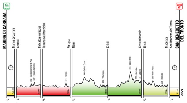 Volviendo a las etapas montañosas, se echa de menos alguna jornada que tenga un gran puerto en los últimos 50 km, para dar una mayor variedad al recorrido y que fuera más factible romper la carrera desde lejos. Lo más parecido es la etapa de Castelraimondo, pero el puerto duro (Sasso Tetto) se encuentra a más de 85 km de la llegada … que se podrían reducir  en más de 30 km con 2 simples cambios: subir Camerino por una vertiente más directa y sobre todo suprimir el circuito final de Castelraimondo, acabando en el primer paso. De todos modos el terreno que hay hasta meta en la etapa original no es nada sencillo, y si la carrera se rompe podría verse un magnífico espectaculo. Eso si, para propiciarlo quizás hubiera sido mejor adelantar la C.R.I., así como no terminar arriba en Macerata, para que los corredores no pudieran especular con las etapas siguientes.