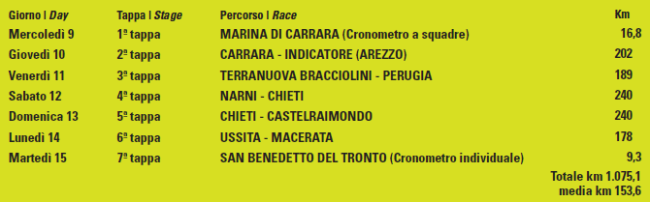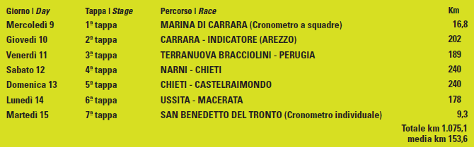El recorrido de este año mantiene las constantes habituales,  al menos en las etapas en línea, con recorridos  rompepiernas, circuitos, y repechos finales. De hecho las tres etapas más duras, Chieti, Castelraimondo y Macerata, son realmente parecidas a las de 2010 (sobre todo teniendo en cuenta el cambio que hubo en la etapa de Colmurano 2010 por cuestiones meteorológicas): no sólo se repiten dos de las llegadas sino que están colocadas exactamente en el mismo lugar, jornadas 4ª – 5ª – 6ª, y  con trazados muy similares, tanto en el tipo de puertos como en los  kilometrajes, «maratonianos» los dos primeros (240 km) y más corto la de Macerata, que repite  circuito.