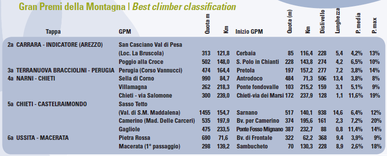 Un tema discutible es la catalogación de los puertos, ya que al igual que el año pasado todas las subidas marcadas dan los mismos puntos, tengan la dureza que tengan, y además hay algunas ascensiones que no puntúan pese a tener similar dureza a otros que si lo hacen (de hecho en la etapa de Macerata solo se puntúa uno de los 3 pasos por el mismo puerto). Pero no parece hecho con mala intencion … al contrario que en otras carreras, donde da la sensación de que los organizadores intentan engañar a los aficionados sobre la dureza real de la prueba, casi siempre inflando los puertos, como sucede por ejemplo en la París-Niza.