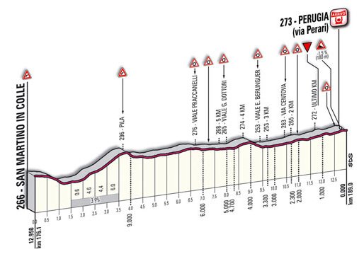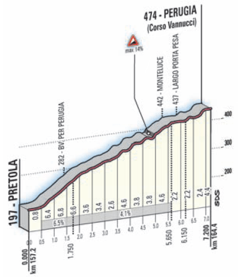 • Perugia -Corso Vanucci- (km 164,4):  474 m – 6,7 km – 4,2 %