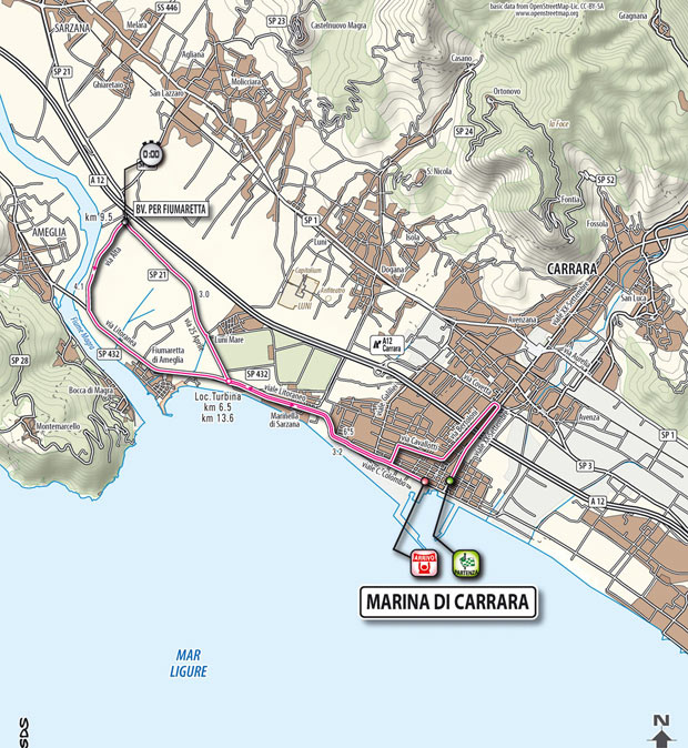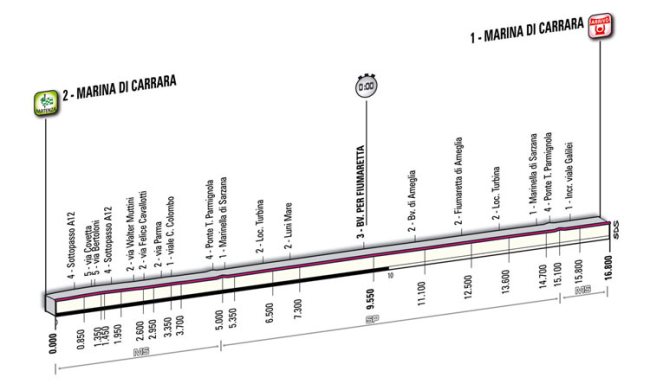 1ª ETAPA (Miércoles 9 Marzo):  MARINA DI CARRARA – MARINA DI CARRARA  (C.R.E.)  (16,8 km).  Rutómetro / Salida / Llegada