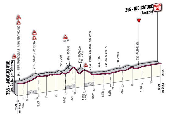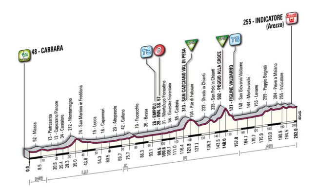 La primera mitad de la etapa no tiene apenas dificultades orográficas, con el repecho de Montemagno como única subida destacable, pero a partir de la localidad de Cervbia (km 116) se entra en una zona de cierta dureza, con los puertos de San Casciano Val di Pesa y Poggio Alla Croce, coronándose este último a 54 km de la línea de meta. Una vez terminado el descenso el recorrido vuelve a ser bastante llano, aunque con 25 km finales ligeramente quebrados antes de la llegada en Indicatore. De hecho en los últimos 10 km hay hasta 3 repechos, pero no parecen suficientes como para evitar una llegada masiva.