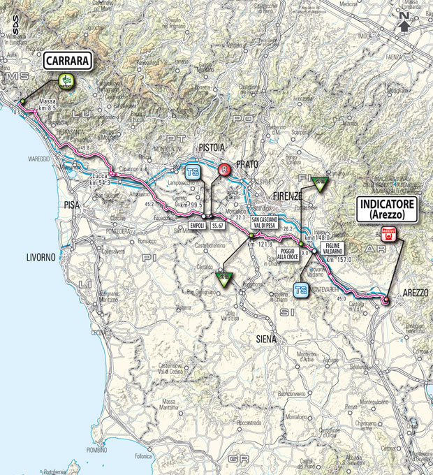 2ª ETAPA (Jueves 10 Marzo):  CARRARA – INDICATORE (AREZZO)  (202 km).  Rutómetro / Salida / Llegada