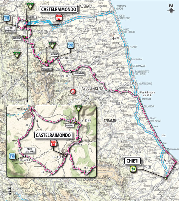 Pasada la pancarta del puerto no hay descenso, sólo un pequeño llano antes de que prosiga la ascensión hasta  llegar a Torrone. No tiene mayor importancia pero creemos que habría sido más lógico contar todo como una única subida, con unas cifras globales de 5,8 km al 5,1%. Alcanzada la cota más alta, irregular bajada hasta Castelraimondo, donde tras un primer paso por la línea de meta se inicia un circuito de 26,6 km que incluye las ascensiones a Castel Santa Maria (4 km al 4,5%), cota de Acquosi y Gagliole, este último un duro repecho por encima del 11% de media. Después de coronar Gagliole, a 6,6 km de la llegada, hay un tramo de falso llano antes de afrontar el complicado descenso hacia Castelraimondo, finalizando la etapa con los 2 últimos km prácticamente llanos … salvo por un pequeño repecho a sólo 400 m de la línea de meta.