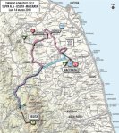 *EDITAMOS – Nos lo avisó un lector del blog y se ha confirmado: el mal estado de varias carreteras por las que iba a transitar la etapa, causado por fuertes lluvias durante la última semana, ha hecho que los organizadores se vean obligados a cambiar el recorrido previsto -> comunicado oficial, modificando el circuito de Macerata, aparte de sustituir Pietrarossa por Tolentino en la parte inicial. Este es el recorrido que se hará finalmente: