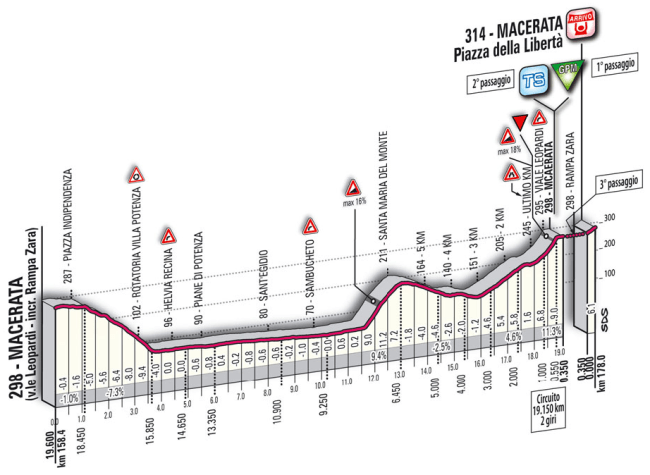 Terminado el descenso de Pietra Rossa se entra en una zona muy rompepiernas, con hasta 4 repechos casi completamente seguidos: Cantalupo, Filottrano, Osterianova y Convento de Forano. La bajada de este último dejará a los corredores ya dentro del circuito final, con las ascensiones encadenadas a Santa Maria del Monte, 1,5 km al 9,4%, y Macerata -viale Leopardi, con datos globales aparentemente flojos, 3 km al 5,5% … pero que esconde medio km al 11,3% y con rampas del 18%. En la última vuelta  se añaden además 0,35 km al 4,6% hasta llegar a la Piazza della Libertá, donde estará situada la línea de meta.