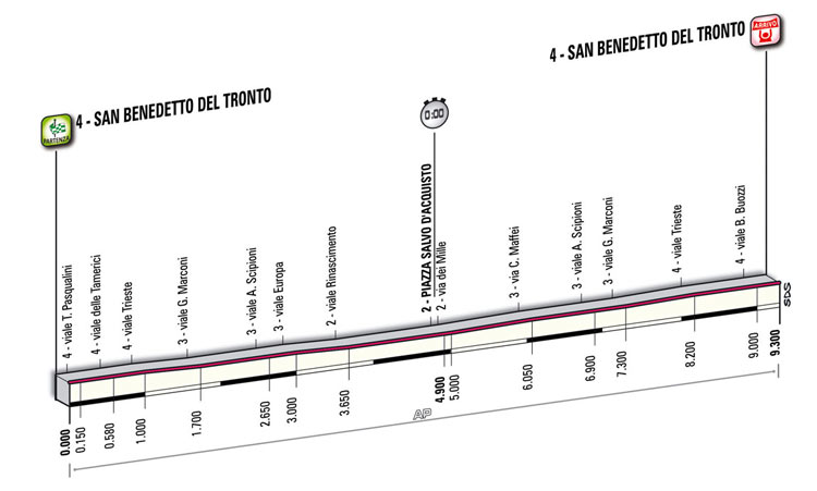 La carrera se despide con una contrarreloj individual de 9,3 totalmente llana, con salida y llegada en San Benedetto del Tronto