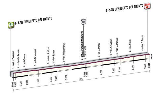7ª ETAPA (Martes 15 Marzo):  SAN BENEDETTO DEL TRONTO – SAN BENEDETTO DEL TRONTO  (C.R.I.)  (9,3 km).  Rutómetro / Salida / Llegada