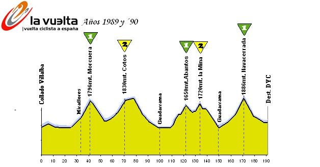 La primera dificultad es el Puerto de Navafría (10,9 Km. al 5,3%) para encarar luego el de Canencia (5 Km. al 5,3%) y llegar así al Puerto de La Morcuera (9,2 Km. al 6,8%) y luego al Puerto de Cotos (10 Km. al 5,4%) para rematar con el Puerto del León / Guadarrama (8,3 Km. al 6,4%). Hasta aquí todo son puertos conocidísimos y muchas veces transitados por La Vuelta, aunque es extraño que un encadenado tan obvio solo se haya visto una vez, en 1980 en la etapa de Segovia a Los Ángeles de San Rafael.