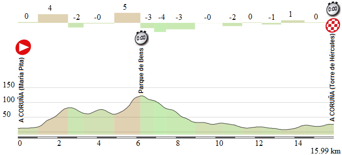 Desde la Plaza de María Pita en el centro de A Coruña comienza esta interesante contrarreloj inicial con un recorrido que, a parte de bonito, presenta varias dificultades para los corredores.