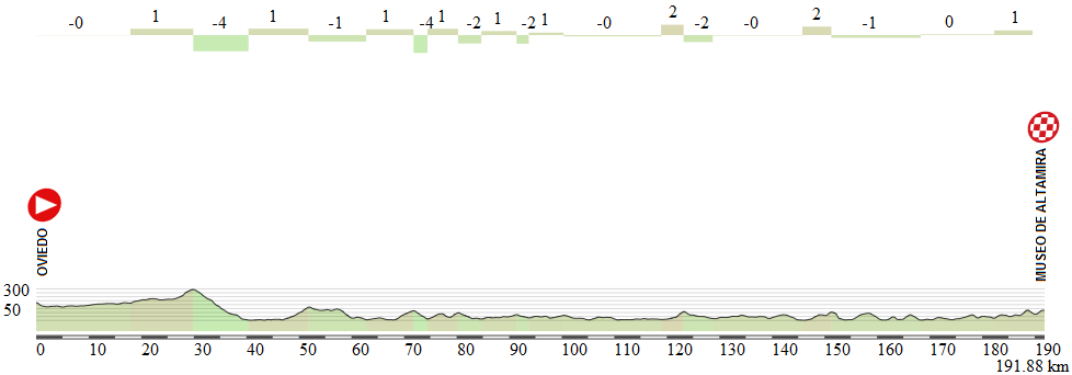 Después del trepidante inicio de carrera llega la primera etapa llana. Pero que nadie se equivoque, que entre Oviedo y Altamira no se podrá relajar nadie en exceso, ya que la etapa discurre casi por completo pegada a la costa cantábrica (con el peligro de viento de costado que ello supone) por la típica carretera costera revirada y con múltiples pequeños repechos. Y donde más abundan estos repechos es en los 45 Km. finales de etapa, dificultando así el control de las fugas… y rematando con dos repechos (1,3 Km. al 5,7% y 700 m. al 7,3%) consecutivos de cara al final, dejándonos este último a solo 800 m. llanos de la meta en el museo.