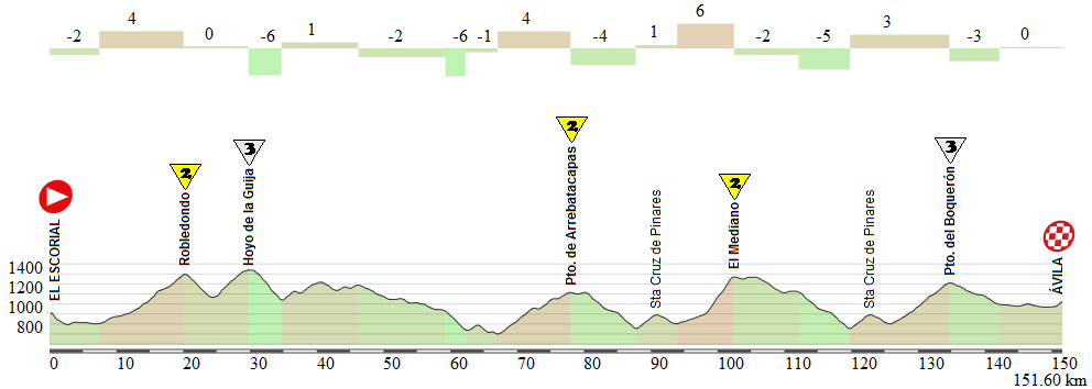 De inicio se afronta la Cruz Verde para continuar hasta coronar el Robledondo y seguir por el alto de Hoyo de la Guija en sentido contrario al habitual, en un terreno perfecto para que se formen una escapada numerosa y se metan en ella buenos escaladores y hombres fuertes. Se baja entonces hasta Cebreros para afrontar la zona peligrosa de la etapa.