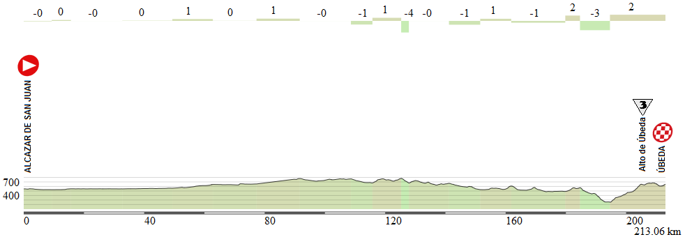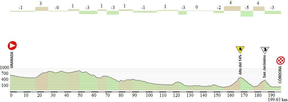 Tras salir de Baeza y pasar por Úbeda,, se afronta la primera dificultad de la jornada, el Alto de Sierra de la Cruz, muy tendido pero que dará juego para las escapadas. Se entra entonces en un falso llano con carreteras secundarias, pero que no supone mayor dificultad hasta que la carrera llegue por primera vez a Granada, donde empezará la verdadera batalla.