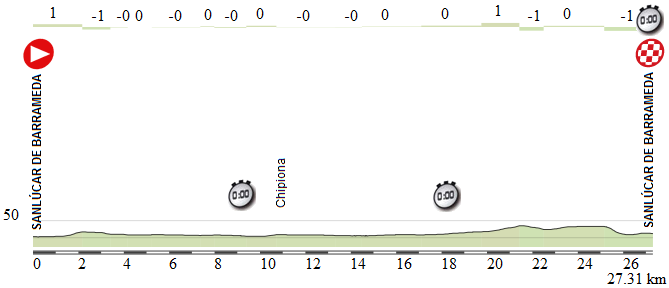 La contrarreloj final tiene como protagonista el Parque Nacional de Doñana, la mayor reserva ecológica de toda Europa y un ecosistema único en el continente debido a la destrucción sistemática que ha sufrido debido al urbanismo. Sin embargo la prueba no trascurre (obviamente) por él, sino por la que es quizá localidad de referencia del Parque, Sanlúcar de Barrameda, separada del mismo solo por la desembocadura del Guadalquivir. Desde ella se hace un recorrido de ida y vuelta hasta Chipiona por distintas carreteras, pero todas ellas perfectamente llanas. Se sale desde la misma playa de Sanlúcar para ir pegados a la costa hasta llegar a Chipiona, donde de nuevo se recorre toda la playa para emprender el camino de vuelta por una carretera más interior terminando con un pequeño callejeo antes de llegar a la meta.