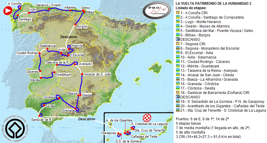 Si el primer recorrido tenia escasez de finales en alto… en este caso hay menos. Y eso tampoco nos gusta, ya que sería muy conveniente poner un final en alto exigente a mitad de carrera (por ejemplo, cambiar el final en Úbeda por Sierra de la Pandera). Pero como tenemos que ajustarnos a la temática del Patrimonio, solo nos fue posible colocar el final en el Monte Naranco en la Península. Y ya en las Canarias, nos pareció contraproducente colocar un final en alto durísimo, aparte de que habría menos espacio para la meta que en los lugares que hemos escogido como llegada.