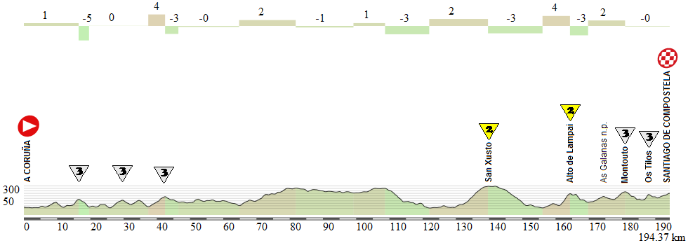 A los que sigan habitualmente el blog ya les sonará este final, pues lo propusimos en la entrada del Parador de Santiago. La etapa comienza en A Coruña siguiendo la costa, pasando por el mismo tramo empedrado de la crono y con carreteras secundarias de continuos repechos hasta llegar a Carballo. Despues llega el tramo sencillo de la etapa hasta llegar a Noia donde comienza un encadenado final de subidas digno de la mejor de las clásicas. Primero se sube el tendido alto de San Xusto, sin mucha dificultad y una carretera ancha impecable. Tras coronar, se gira dirección sur hacia Rois y Padrón, desde donde se encara el muro de Lampai por Cruxeiras (2,93 Km. al 8,9% – max. 20%). De ahí a meta quedan siguen las dificultades con 4 repechos: As Galanas (2 Km. al 3,5%); Montouto, 2,2 Km. al 6,2% pero con máximas del 20%; la trampa de Os Tilos de 1,15 Km. al 10,5% y máxima del 18% que se corona a solo 6 Km. de la meta a la que se llega tras unos 3 Km. de ascensión continuada al 3-4%.