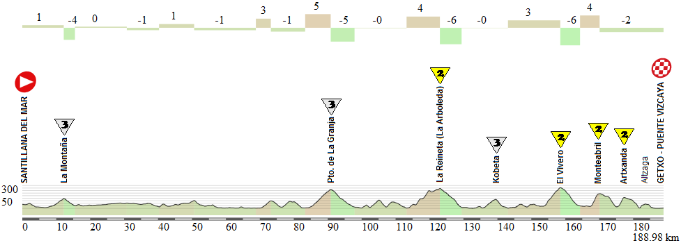 El recorrido llega al País Vasco desde Cantabria con una etapa aprovechando lo mejor que tiene el terreno vasco… los puertos cortos de pendientes muy duras enlazados de forma consecutiva.