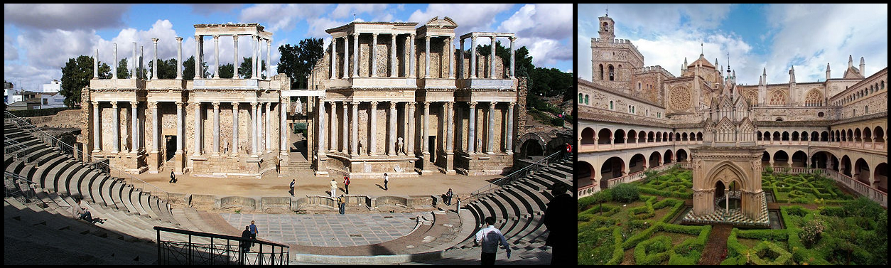 El teatro romano de Mérida y el Monasterio de Guadalupe, dos de los grandes símbolos de Extremadura. Fotos de wikipedia.org.