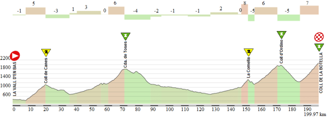Pero hay más posibilidades en Andorra, principalmente incluir La Rabassa (hasta Km. 4) como puerto de paso previo al Coll d’Ordino, ganando así otro buen «primera» cerca del final, convirtiéndolo en una grandísima etapa de montaña, sobre todo para una vuelta de una semana. La «pega» en este caso sería que la etapa se va a 220 Km. si se sale de La Vall d’en Bas, sin embargo un etapón así sería una gran forma de celebrar el centenario de la prueba, y además se compensaría perfectamente con la crono. Perfil de esta opción.