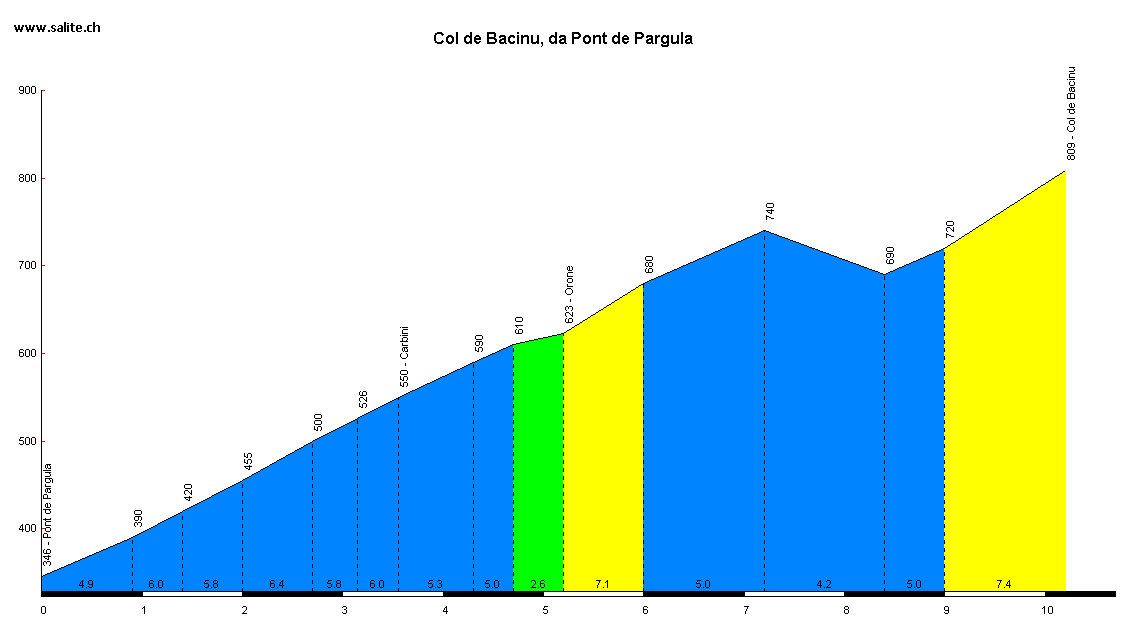 - Col de Bacinu (km 156,5): 819 m – 10 km – 4,5 %