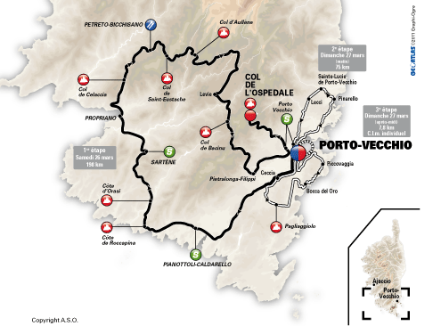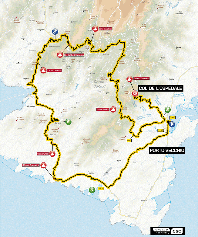 La parte inicial del recorrido es relativamente sencilla aunque incluyendo varios repechos, entre ellos la pequeña cota de Roccapina. Pasado el km 40 cambia el sentido de la ruta, dirigiéndose hacia el norte por la carretera que atraviesa la cota de Orasi y la localidad de Sartene, donde estará situado un sprint especial. A partir de ahí, descenso hacia Propiano y enseguida comienza la ascensión al Col de Celaccia (el inicio es distinto), 9,5 km cercanos al 6% de media, tras cuyo tendido descenso los corredores tendrán que afrontar el Col de Saint Eustache, con cifras globales parecidas a Celaccia: 11 km al 5,4 %. Estos 2 puertos son la mayor novedad de la etapa, ya que no se pasaron en 2010.