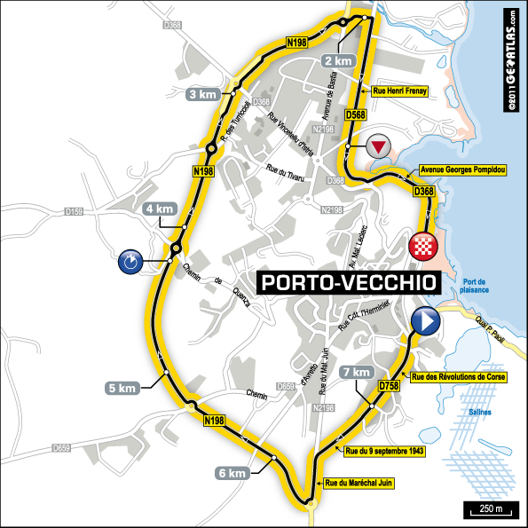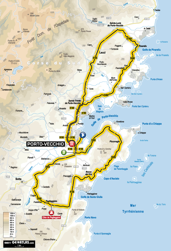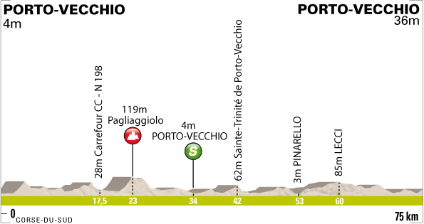 Etapa muy corta (apenas 75 km), con salida y llegada en la localidad de Porto Vecchio y que se disputará en horario matinal. El trazado, idéntico al de 2010, es básicamente llano aunque salpicado por tendidos repechos, siendo el de mayor entidad la cota de Paglioggiolo, en el km 23 del recorrido. Un detalle importante es que la llegada pica hacia arriba, con 600 m finales al 4%.