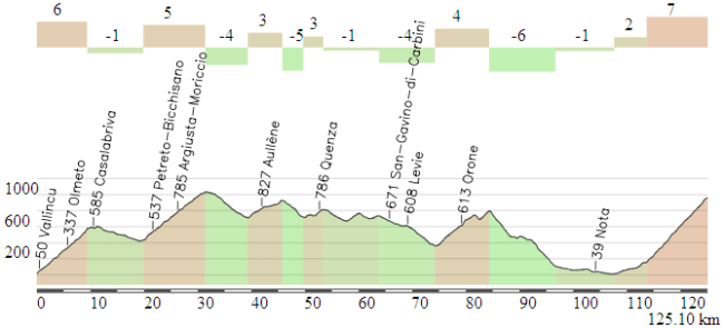 - Côte de Pagliaggiolo (km 23): 119 m – 2,2 km – 4,5 %