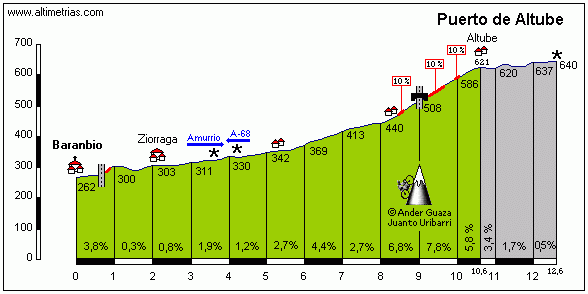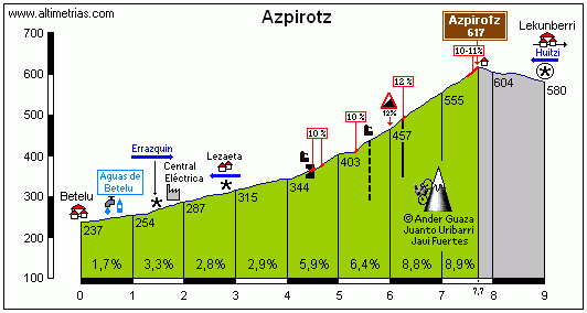 Azpirotz se pasará en 2 ocasiones, la primera muy lejos de meta (km 65) pero la segunda a sólo 3 km de la llegada. Click para ver una descripción detallada.