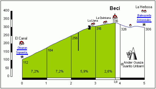 Beci, una ascensión muy habitual en la Vuelta al País Vasco, será el último puerto de la etapa. Perfil de APM, click para ver una descripción detallada.