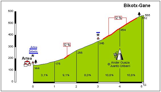 Después de coronar hay un corto descenso y un tramo llano de 10 km hasta llegar al alto de Dima, donde se inicia una tendida bajada en busca de la localidad homónima. A partir de ahí hay un pequeño tramo llano hasta la población de Artea, punto de inicio de la dura ascensión a Bikotx-Gane, que con un tramo de 4 km al 9,7 % podría haber sido considerado perfectamente de 1ª categoría, sobre todo con el baremo habitual de los organizadores. De hecho no tiene nada que envidiar a Arrate y es mucho más duro que Azpirotz.