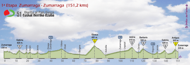 1ª ETAPA (Lunes 4 Abril): ZUMARRAGA – ZUMARRAGA (151, 2 km). Perfil oficial / Rutómetro