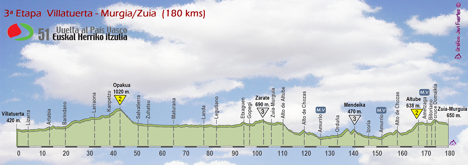 La primera mitad de la etapa no tiene mayores complicaciones, con el puerto de Opakua y su largo falso llano previo como única dificultad reseñable. Será a partir del km 90, al llegar a las proximidades de Zuia-Murgia, cuando el terreno se vuelva mas «pestoso», con el repecho puntuable de Zarate seguido por la bajada de Altube y el alto de Las Chozas (también conocido como Astobitza), antes de hacer un primer paso por Amurrio. Tras esta localidad y un pequeño tramo llano los corredores tendrán que afrontar el pequeño puerto de Mendeika, que en realidad son dos ascensiones encadenadas (algo que no se refleja en el perfil oficial): Hafade y Olaran, cortas pero con buenas rampas y por carretera estrecha. Curiosamente, y al igual que sucedió el año pasado, la organización ha puntuado solo la segunda pese a tener menor altitud y desnivel que la primera.