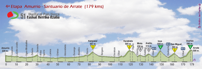 4ª ETAPA (Jueves 7 Abril): AMURRIO – EIBAR (ARRATE) (179 km). Perfil oficial / Rutómetro