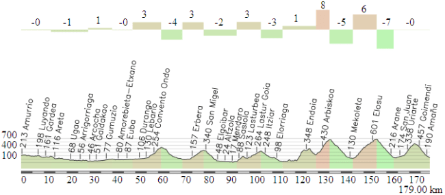 Los primeros km de la etapa son muy pestosos, con la ascensión puntuable a Gabiria seguida por los duros repechos de Liernia, Serain y de nuevo Liernia antes del primer paso por Eizaga y la meta volante de Zumarraga. A partir de ahí el terreno pica casi siempre hacia arriba hasta alcanzar el alto de Udana, que por esta vertiente no pasa de ser un falso llano. Una vez en la cima, suave descenso en busca de Oñati al que siguen unos 15 km más o menos llanos hasta llegar al inicio del Puerto de Elosua-Gorla, la ascensión más dura de la etapa con 7 km al 7,7%. De hecho, aunque está catalogado de 2ª se podría considerar perfectamente un 1ª … sobre todo con el baremo que muestran los organizadores en otras subidas.