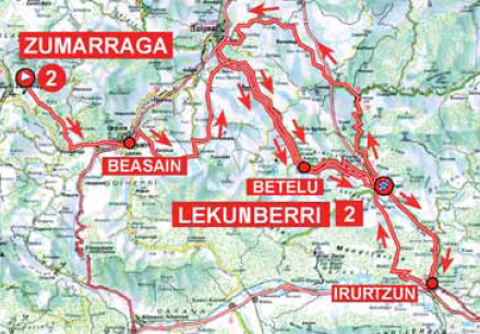 La parte inicial de la etapa es bastante sencilla, hasta que a la altura del km 25 los corredores tendrán que afrontar el puerto de Larraitz, catalogado de 2ª aunque no pasa de ser un 3ª, y la corta subida de Altzo, con 2 km al 7% segun datos oficiales. Después de la bajada de este último hay un tramo llano en busca de la población de Betelu, aunque la carretera va aumentando poco a poco su inclinación hasta que pasada esa localidad culmina con el primer paso por el puerto de Azpirotz y la meta de Lekunberri.