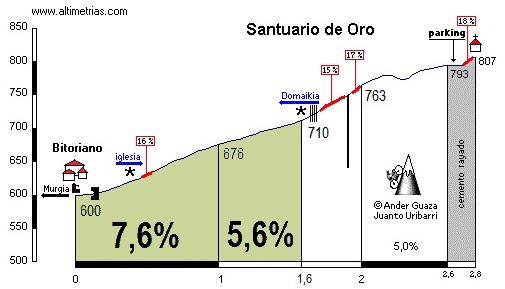 Superado el puerto no hay bajada sino una zona de falsos llanos antes de tomar un desvio hacia la localidad de Bitoriano y afrontar un repecho bastante serio: 1,6 km a casi el 7% … y rampa máxima del 16%. Este repecho es la primera parte de la subida al Santuario de Oro, aunque en esta ocasión se girará hacia la localidad de Domaikia antes de llegar a la zona más dura.