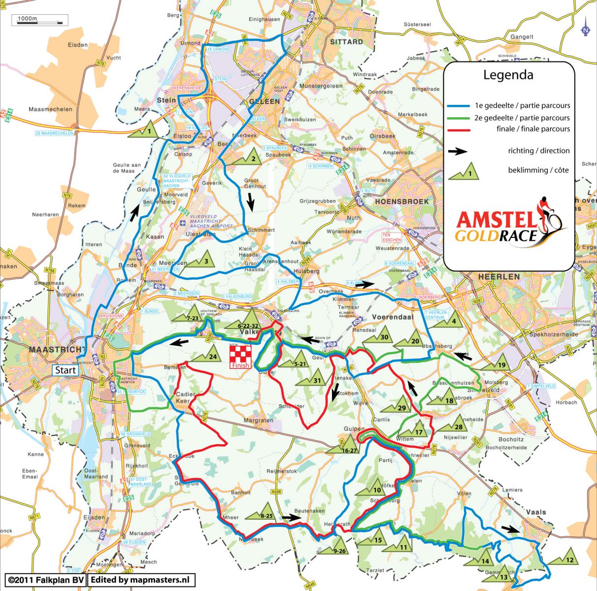 A nivel de recorrido, la Amstel Gold Race se caracteriza por realizar varios bucles distintos en torno a la localidad de Valkenburg, con un trazado muy quebrado y «pestoso» que incluye un gran número de cotas (32 este año) e infinidad de cruces, cambios de dirección y estrechamientos que hacen que sea una carrera muy nerviosa y complicada para los corredores. En los últimos años ha cambiado el final de la prueba, ya que hasta 2002 la llegada era en la ciudad de Maastricht, después de un tramo llano, y sin embargo desde el año 2003 la carrera finaliza en la cota del Cauberg, en el propio Valkenburg, siendo una llegada muy propicia para los «up-hill finishers».
