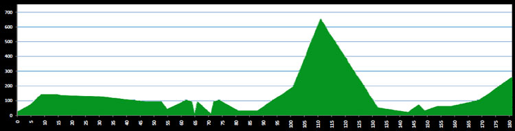 Como se ve en el perfil, el trazado cuenta con varios repechos, el primero de ellos prácticamente de salida aunque muy tendido. Después de alcanzar la cota más alta de ese primer repecho hay varios km con tendencia descendente, hasta que en km 10 de la crono los corredores se enfrenten a una nueva ascensión: 1,2 km al 4,8% (aproximadamente) y con un tramo central algo más empinado. La subida termina a 2,5 km de la llegada, los 2 primeros de suave bajada pero con 500 m finales llanos.