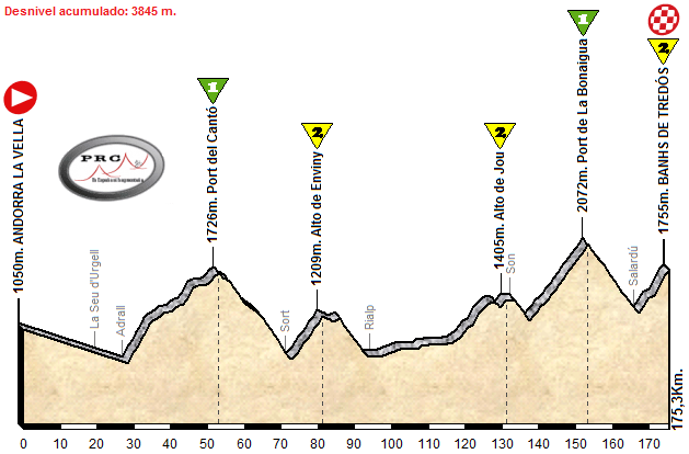 Entrando ya en detalle en la etapa, se divide claramente en dos bloques. En el primero se sube el conocidísimo y largo Port del Cantó, con 24 km al 4,5% bastante irregulares, concentrándose la mayor dureza al inicio. Sin solución de continuidad desde Sort se asciende al Alto de Enviny (8 km al 6,4%) para bajar luego a Rialp y comenzar un tramo sencillo de unos 25 km llanos, siendo a priori favorable para el trabajo de equipo.