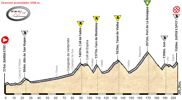 Esta primera etapa comienza en Barbastro con unos 80 Km. iniciales muy sencillos, cuya única dificultad es el Alto de San Roque, de 3ª, donde seguramente sean múltiples los intentos de escapada. A partir de ah se sigue dirección norte hasta penetrar en las impresionantes paredes del Congosto de Ventamillo, «puerta de entrada» a las verdaderas dificultades de la etapa.