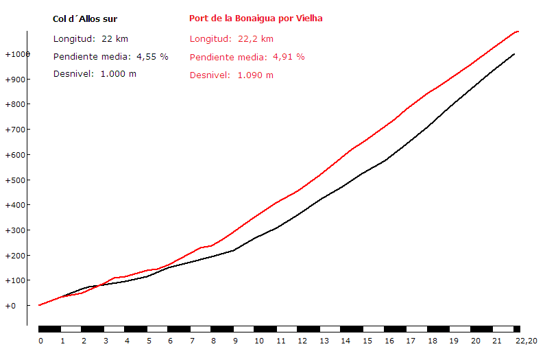 Como en anteriores ocasiones y para que se se aprecie mejor la exigencia del puerto tratado, presentamos una comparativa de cada vertiente con otras ascensiones ya conocidas. La vertiente oeste de la Bonaigua tiene unas características muy similares al Col d´Allos sur, si bien le gana en dureza. Este puerto francés ha sido poco utilizado en los últimos años, pero fue clave en la mítica jornada de Pra-Loup 1975 y también es conocido por formar parte de la etapa Allos-Vars-Izoard, un clásico del Tour hace varias décadas.