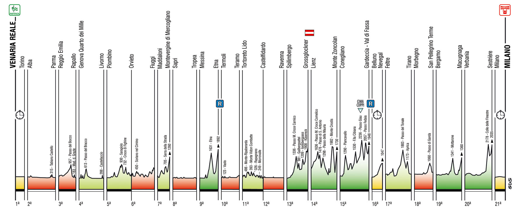 Este año se ha llegado al extremo de que varias etapas han cambiado hasta en 3 ocasiones respecto a lo anunciado en octubre, como la etapa de Montevergine -> recorrido original / final o la jornada de Tirano, que de hecho acababa inicialmente en Sondrio. Otra variación importante ha sido el final de la etapa del Grossglockner, terminando 7 km más adelante respecto a lo previsto (en la cota 2.140 m en vez de en Kasereck) o la etapa de Orvieto, sustituyendo el puerto asfaltado de Nibbio por más tramos de «sterrato». No todos los cambios son a peor ni mucho menos, pero deberían cuidar más este tema.