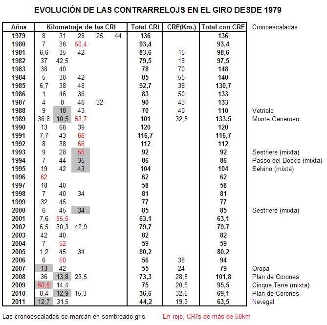 El principal error del recorrido es, a nuestro juicio, la escasez de km contra el crono, sobre todo en un trazado tan montañoso como el de este Giro 2011. Si los organizadores quieren un recorrido «a lo grande», ¿por que aplican la dureza y los largos kilometrajes sólo a la montaña y sin embargo no hay ni una contrarreloj de más de 35 km?. Podría tener sentido reducir las cronos si tampoco hubiera muchos finales en alto, obligando a que los corredores tuvieran que atacar desde lejos para conseguir diferencias, ya fueran rodadores o escaladores. Pero con el «empacho» de llegadas en alto de este Giro y la escasez de contrarreloj queda un recorrido completamente desequilibrado, donde los escaladores no tienen a priori necesidad de moverse en los puertos de paso.