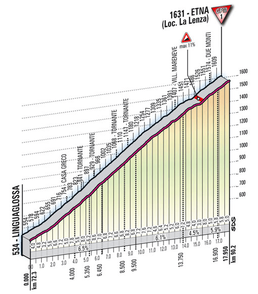- Etna (Rifugio Citelli), 1ª (km 90,2): 1.631 m – 18 km – 6,1 % *sin contar el tramo previo
