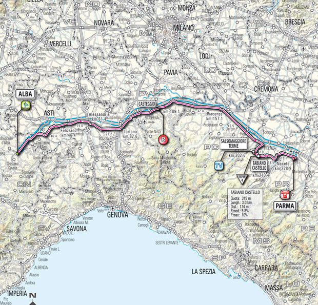 La primera etapa en línea es sorprendentemente la etapa más larga de toda el Giro, con nada menos que 244 km de recorrido entre las localidades de Alba y Parma.