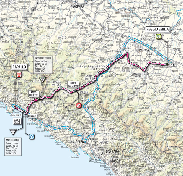 Las primeras 3/4 partes de la etapa son básicamente llanas, si bien el terreno va picando casi siempre hacia arriba (aunque de un modo muy suave). Es a partir del km 127, al paso por la localidad de Santa María del Taro, cuando se complica la ruta con el inicio del Passo del Bocco. Una vez coronado, a 40 km de la línea, hay un largo y revirado descenso en busca de Chiavari y la costa mediterránea.