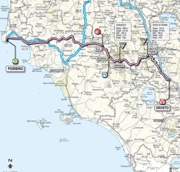 El inicio de la etapa no tienen apenas dificultades, pero pasado el km 55 los corredores tendrán que afrontar la subida a Roccastrada, que no puntúa pero se podría considerar perfectamente un 3ª. Después de la bajada hay unos 20 km llanos antes de comenzar el siguiente puerto: la larguísima e irregular ascensión a Saragiolo, más de 30 km con zonas de cierta exigencia pero también descansillos e incluso bajadas intermedias de varios km, como la anterior a Santa Fiora. Seguramente ese sea el motivo por el cual la organización sólo ha contado como puerto el último tramo, aunque no deja de ser un poco extraño ya que la subida previa es más dura.
