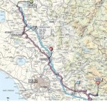 Una vez coronado (a 44 km de meta) y tras un pequeño falso llano, descenso en busca de Prata di Principato Ultra y un pequeño repecho, entrando en una zona más o menos llana de casi 15 km aunque picando hacia arriba a partir de Avellino. Será a 17 km de meta cuando se inicie oficialmente la subida a Montevergine, bastante larga pero sin un solo km por encima del 6,5%. Eso sí, es bastante escénica gracias a su elevada cantidad de curvas de herradura, como se puede ver en el mapa de la ascensión.